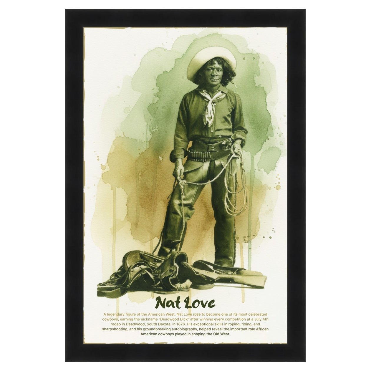 Honor one of the American West's most celebrated cowboys with this stunning watercolor tribute to Nat Love, the legendary figure who earned the nickname "Deadwood Dick" through extraordinary skill and unmatched courage. This powerful portrait captures the spirit of a man whose remarkable life story helped reveal the vital role African American cowboys played in shaping the frontier.