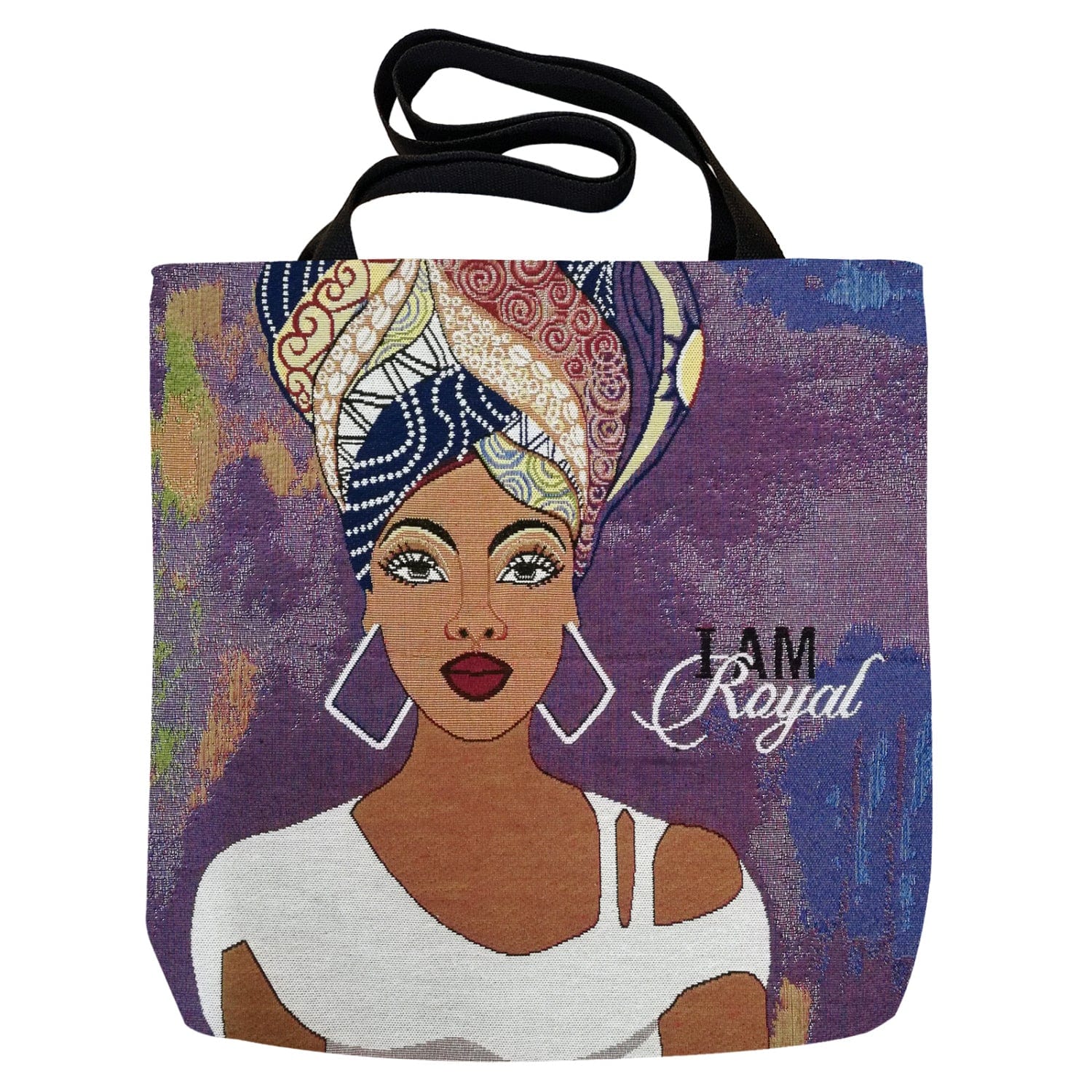 The design on this tapestry tote was created by Sylvia "Gbaby" Cohen . The Afrocentric image depicts a beautiful Black woman adorned in a headwrap that knows her worth and refuses to settle. The words on the tote bag read: