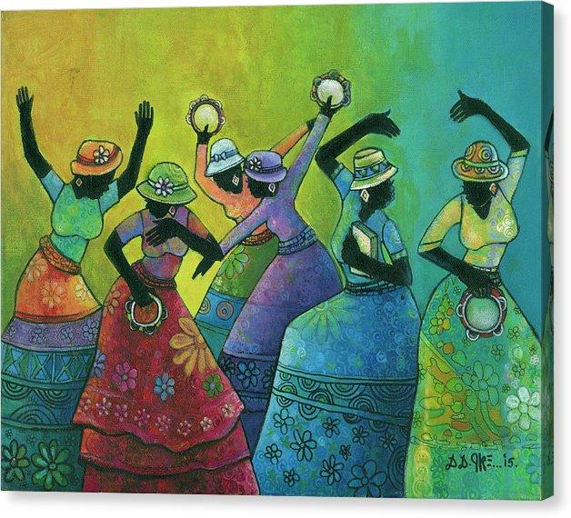 A stunning colorful work of art by Nigerian born artist D.D. Ike. It depicts a group on African women during praise and worship playing the tambourine and giving all praise and glory to the Messiah Jesus and the Heavenly Father through music, dance and words.