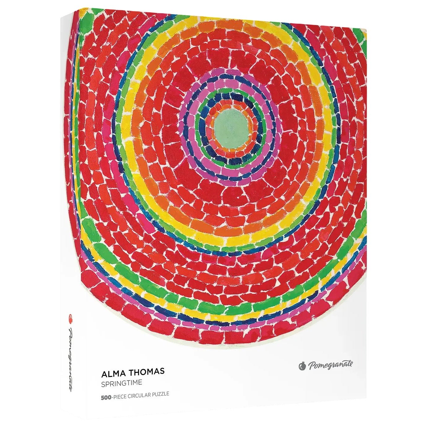 In this captivating circular puzzle image, Thomas's signature style radiates with pure joy and vitality. Concentric circles of brilliant color pulse outward from a soft green center like ripples in a pond or the unfolding of spring itself. Bold reds dominate the composition, interspersed with vibrant bands of yellow, orange, pink, blue, and green.
