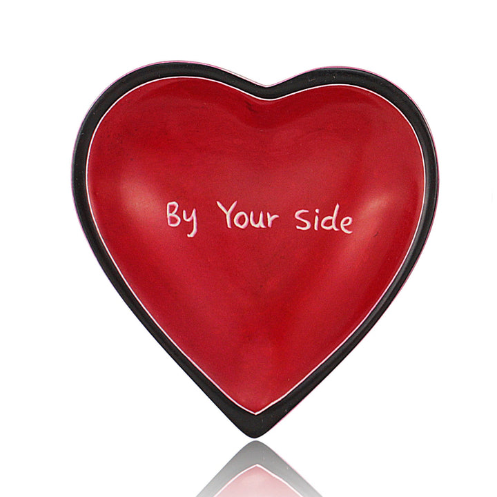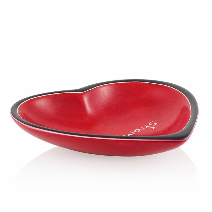A popular red and black soapstone heart shaped dish set. This set features three soapstone dishes that are adorned with the following phrases "XOXO", "Love Always" and "By Your Side". Each soapstone dish was hand made by an African artisan in Kenya. Each one is unique so there might be a very slight variation in size. Each dish measures approximately 4.25 inches (Length) x 4.0 inches (Width) x .75 inches (Height) and weighs approximately 3 ounces. All of of these vibrant dishes are Fair Trade Certified and help support Kenyan artisans, families and communities.