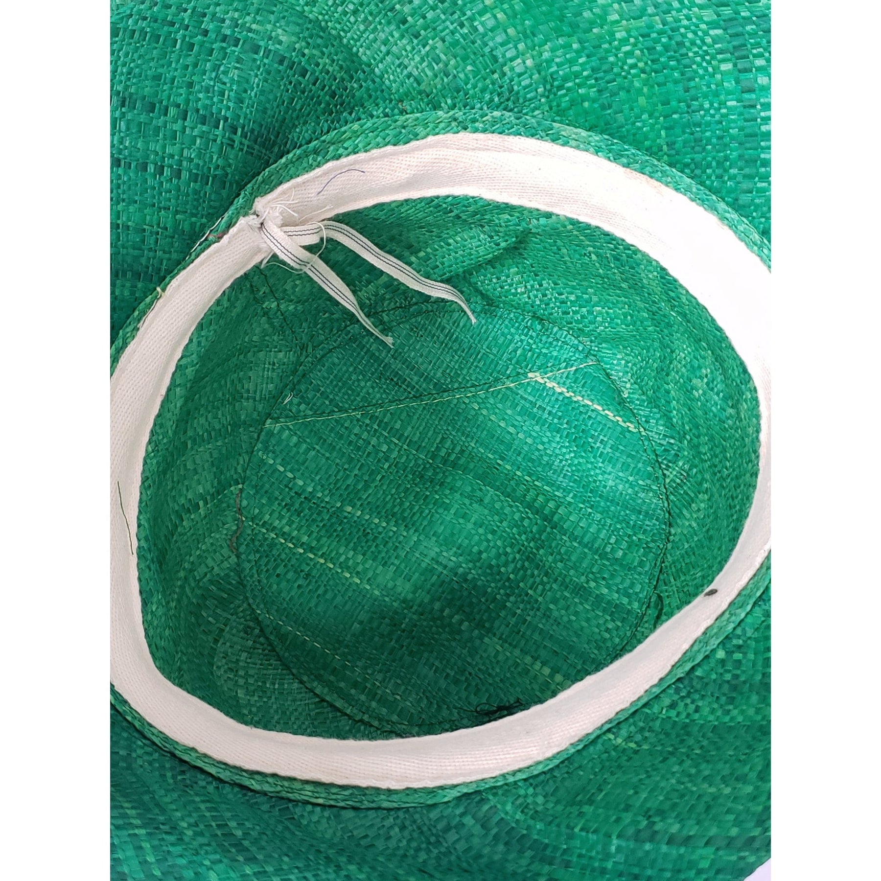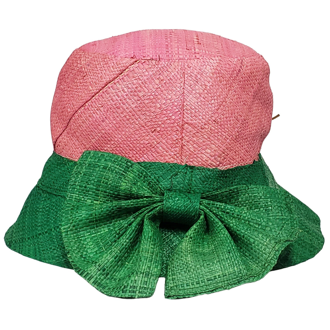 A beautiful handmade pink and green bell-shaped hat with an oversized bow crafted in the country of Madagascar. This hat is adjustable with a drawstring interior to fit head sizes of 59cm or smaller. It is also an eco-friendly product crafted from natural Raffia and other renewable and sustainable raw materials utilizing a variety of energy-saving techniques.