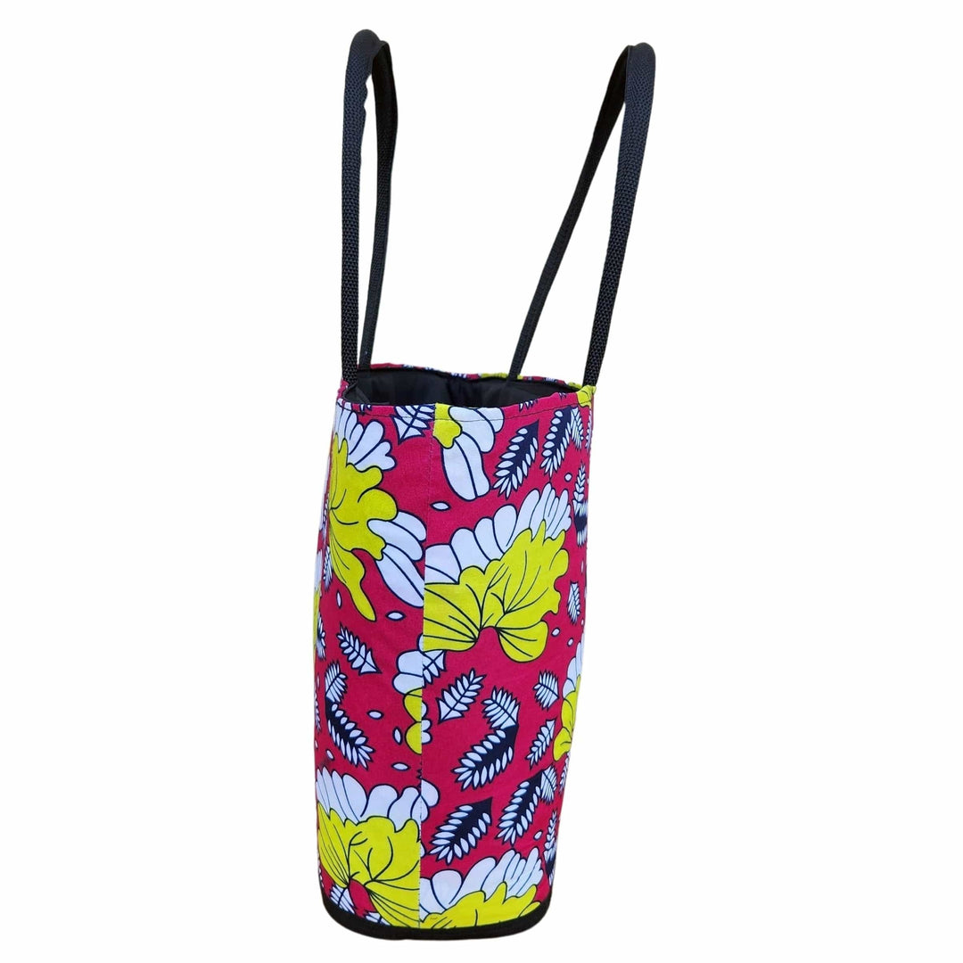 A handmade tote, expertly crafted in Madagascar by skilled artisans. This unique tote features a blend of West African and Malagasy design elements. The exterior boasts beautiful African wax print fabric, with bold, vibrant patterns that are sure to turn heads. While the shape and source materials of this bag are of Malagasy origin.