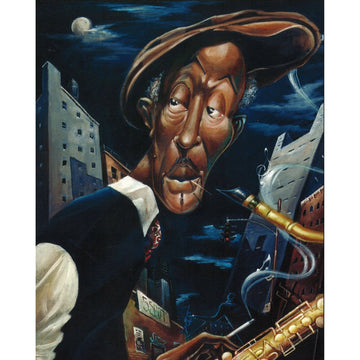 The saxophonist personifies "Straight No Chaser" with his confident presence and raw, unfiltered sound. He is dressed in a sweater vest, necktie, and paperboy hat, holding his saxophone like an extension of his soul. His music flows like a pristine river, untainted by the embellishments that often cloud the clarity of true artistry. Each note he plays is pure emotion, striking with the precision of a well-aimed arrow, bypassing superficiality to touch the audience's heart. His saxophone sings with a voice as clear as crystal, cutting through the ambient noise with the boldness of sunrise breaking the day. This musician has mastered his craft, delivering straightforward and captivating performances, leaving listeners in awe.