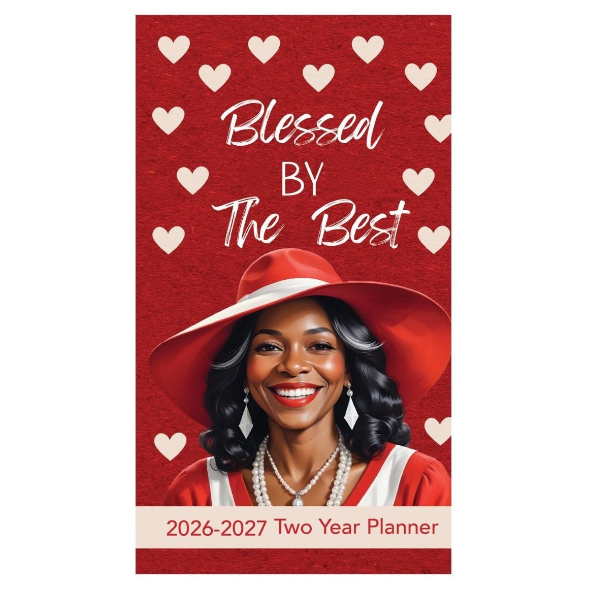 This beautifully designed 2026-2027 two-year pocket planner features an elegant portrait of a confident Black woman adorned in crimson and cream, colors that symbolize courage, fortitude, and purity of purpose. Her graceful pose showcases a stunning red wide-brimmed hat, lustrous pearls draped in multiple strands, and crystal chandelier earrings that catch the light. Set against a rich crimson background adorned with ivory hearts, the design radiates sophistication, joy, and the warmth of sisterhood.