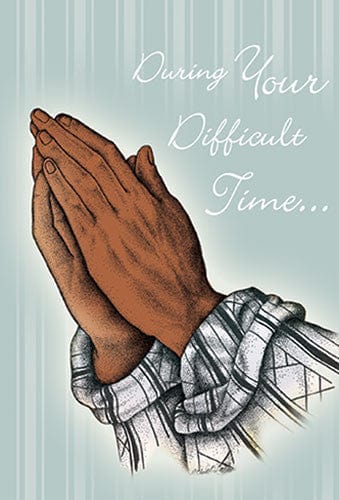 An African American Sympathy Card adorned with an image of two Black hands clasped in prayer and the words "During Your Difficult Time" on the cover. This stunning greeting card measures 5x7 inches and features full color artwork on the inside and out and a high gloss finish. The sentiments inside of this greeting card read as shown below:
