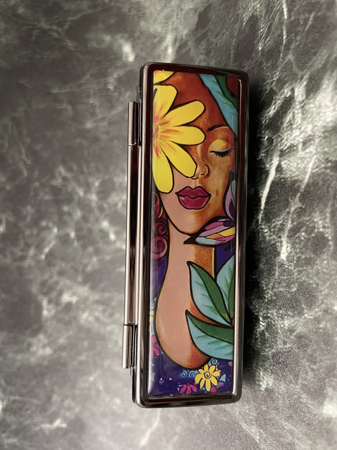 A beautiful yet sturdy lipstick mirror case inspired by African American culture featuring an epoxy dome adorned with artwork from Pamela Hills depicting an African American woman in a nature setting.