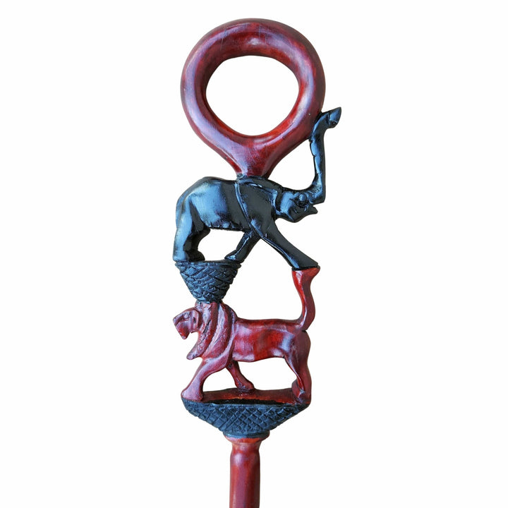 An authentic decorative African Walking Stick hand carved by skilled Makonde artisans in Tanzania. It is crafted from African Mahogany wood and features an image of an Elephant and a Lion, two of the noblest creatures of Mother Africa.
